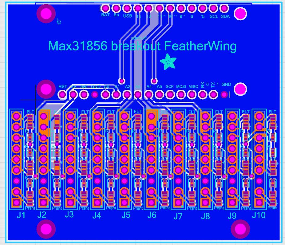 A breakout board for the Adafruit Feather form factor which breaks out the SPI bus into 10 channels each with a unique C/S pin, for the purpose of attaching multiple adafruit MAX31856 breakout to a single feather.