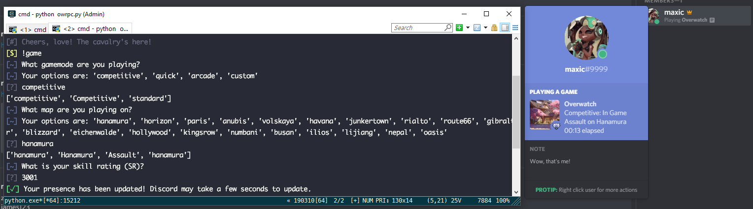 python owrpc.py. You should be greeted by the program! - That's it, you're done! 🎉 Now, run