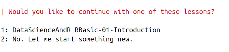 ps. 如果你之前有進行過swirl的課程,swirl會出現下圖的選項詢問你是否要接關。請根據你的需求作答: