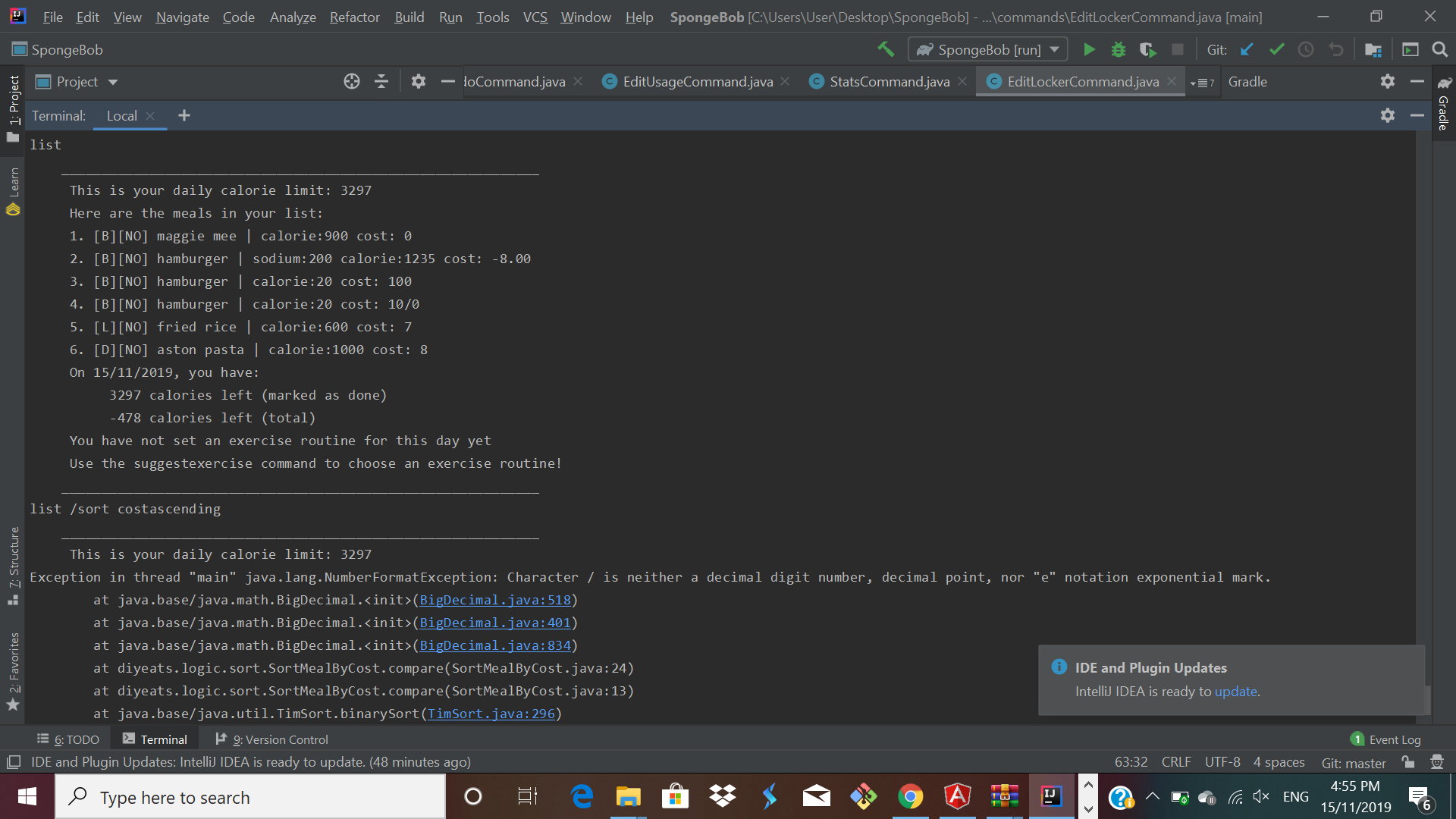 Due to no checks being done with costs, the program throws exception when i try to sort the list as per the cost. I am asusming similar bugs for lunch and thus not reporting it.