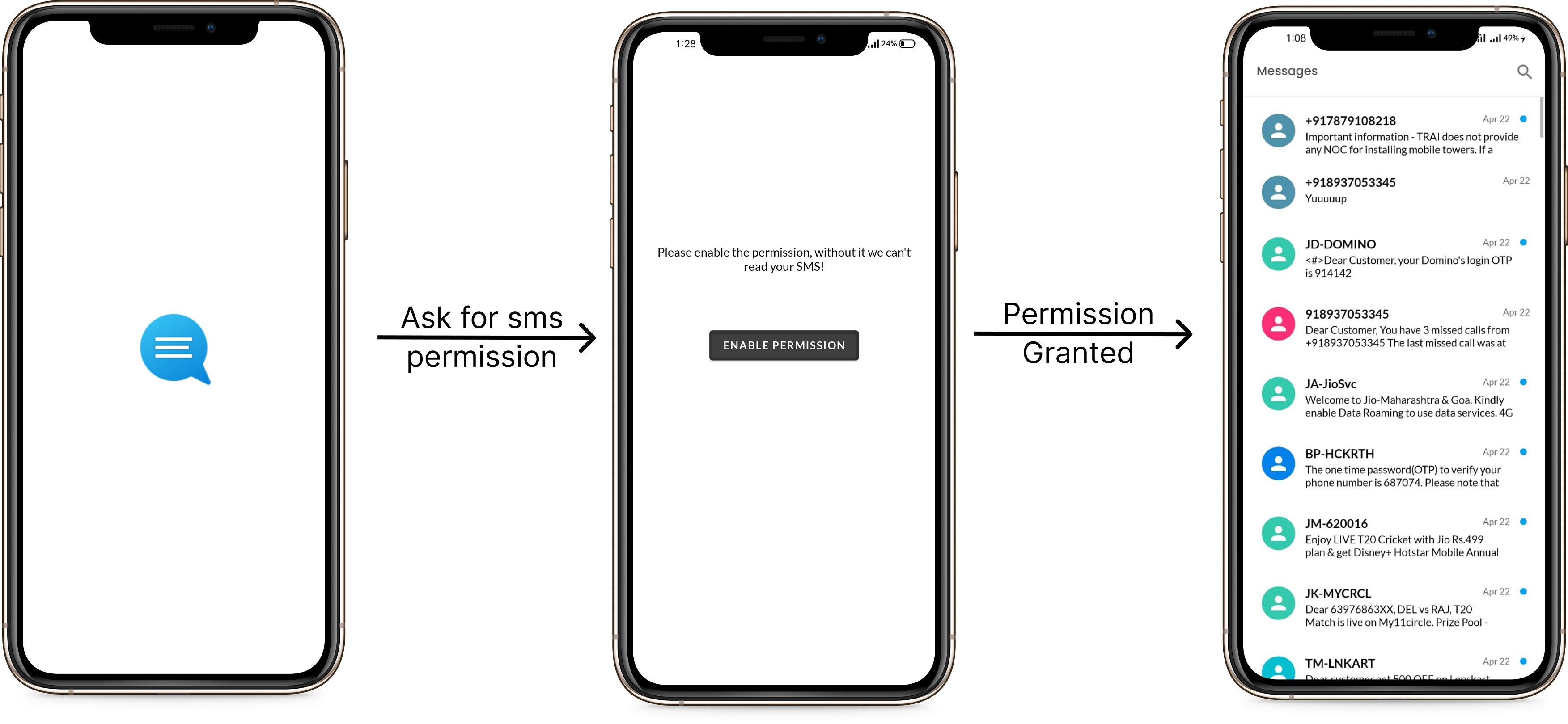 When the user opens the application for the first time, the user is asked to grant permission to read/receive SMS. Once the permission is granted, the application shows the homescreen with all the previous SMS of the user. If the permission is not granted, the user is asked again, or else the user navigates to the settings screen of the application where the user can manually grant the permission.