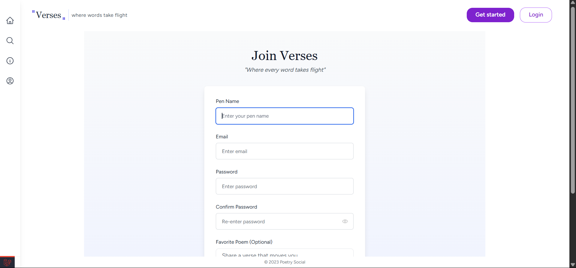 Verses is an innovative social poetry platform that enables free creative collaboration and expression. Our mission is to provide an inclusive space for poets and writers to share their work, connect with others, and discover new voices without barriers. The platform features a clean, intuitive interface designed to put the focus on the art of poetry.