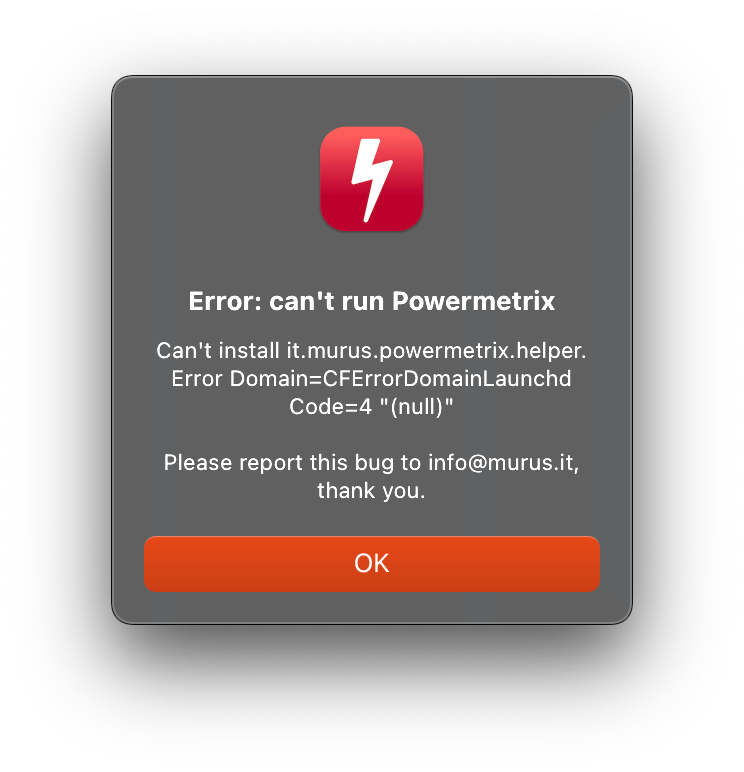 Getting this error after installing the Helper. <img width="372" alt="image" src="https://user-images.githubusercontent.com/58256328/209747316-aaf8399c-c23f-44da-8c4b-27856d803d03.png"> _Can't install it.murus.powermetrix.helper. Error Domain=CFErrorDomainLaunchd Code=4 "(null)" Please report this bug to info@murus.it, thank you._ 13.1 Ventura on M1 Pro 10c 16c