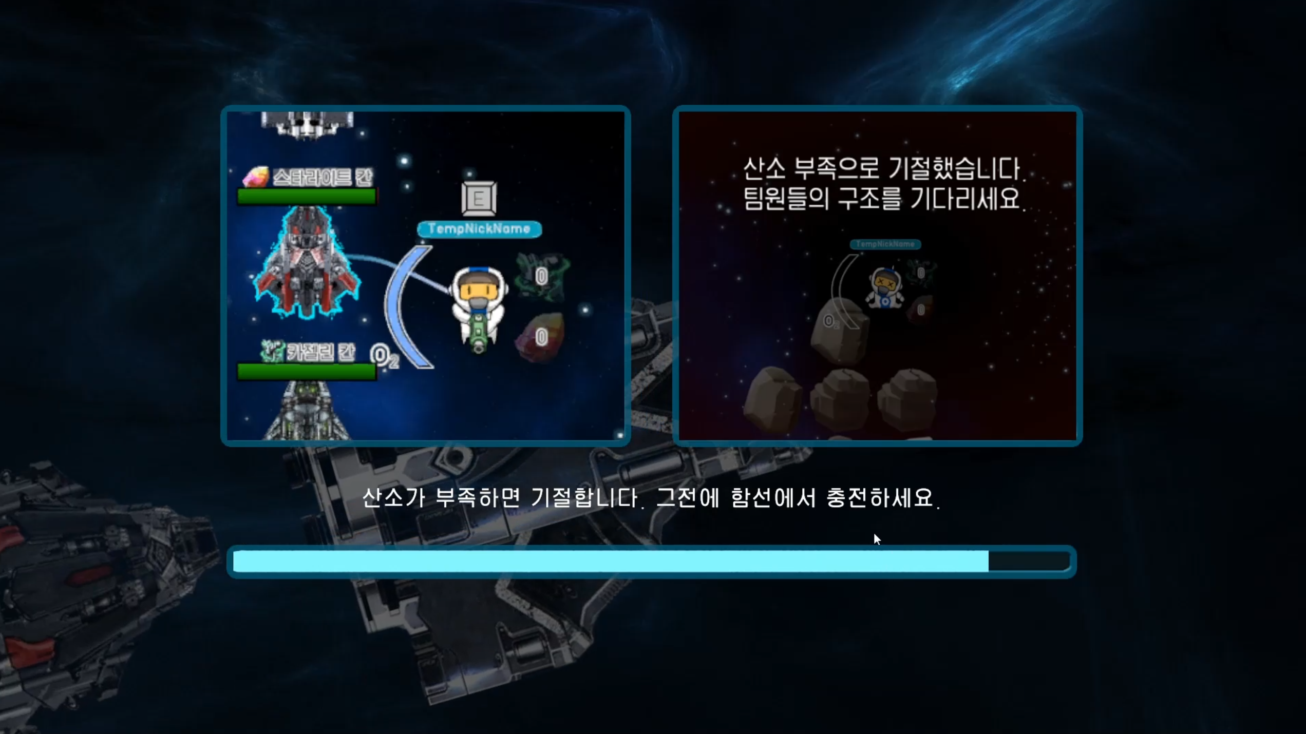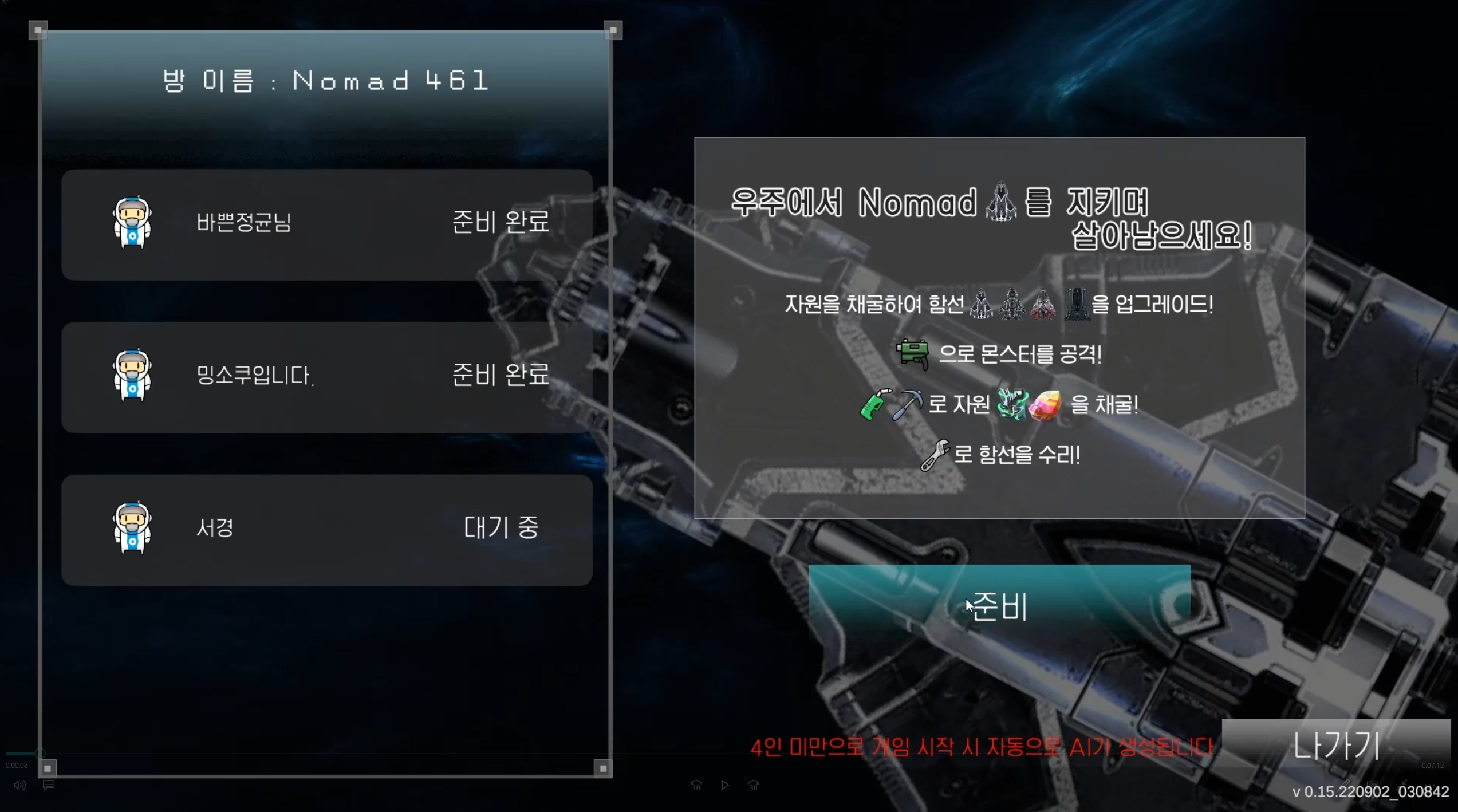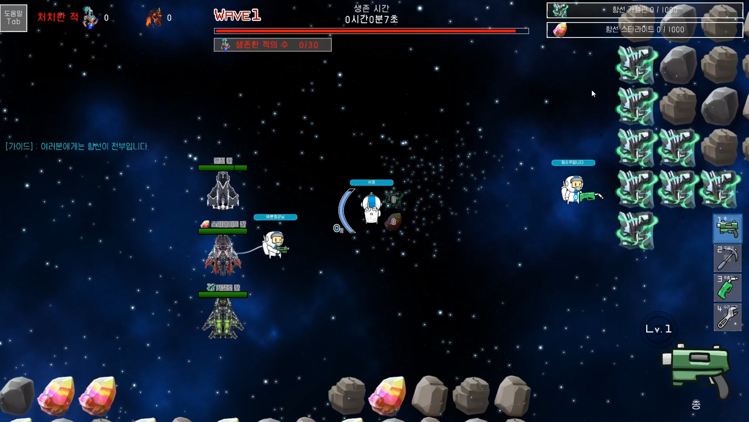 Nomad 엔픽셀_픽셀캠프 프로젝트를 통해 팁 : 공집합의 Nomad 게임입니다. 드넓은 우주에 남게된 당신과 동료들.. 주기적으로 찾아오는 몬스터들에게 대항하기위해서 자원을 캐서 함선과 자신을 업그레이드해서 생존하세요! 1. 닉네임을 설정하세요 2. 방을 만들거나 참가해서 로비에서 게임을 시작하세요 3. 로딩을 기다리세요 4. 게임의 시작화면 입니다. 단축키를 Tab키를 눌러서 확인하세요. 5. 자원을 캐세요! (StarLight, Cazelin 2종류 입니다) 6. 함선을 업그레이드 하세요! 각각의 칸마다 특성이 있습니다. 7. 자원을 통해 업그레이드한 자신을 통해서 몬스터들의 웨이브를 막아내서 생존하세요! 8. 아래와 같이 게임오버가 나지않게 버티면서 생존하세요! 건투를 빕니다.