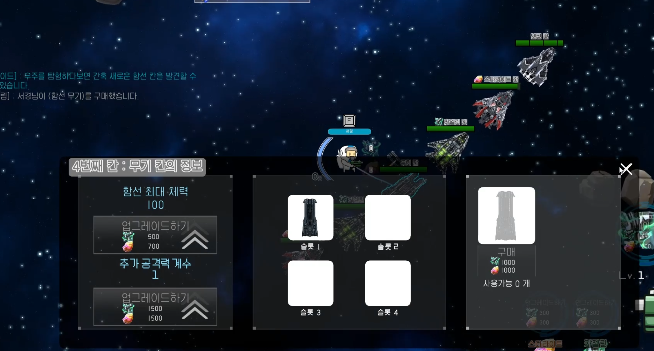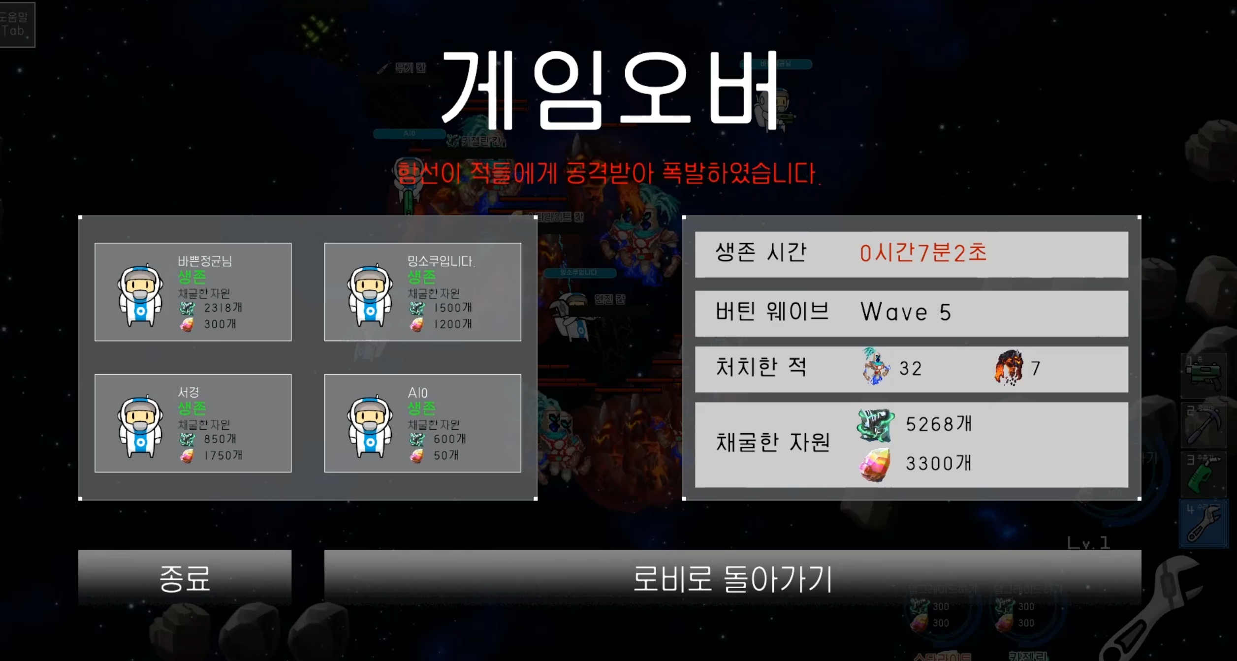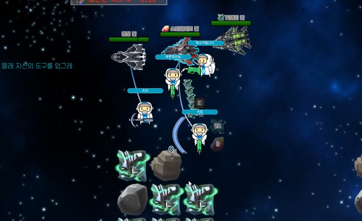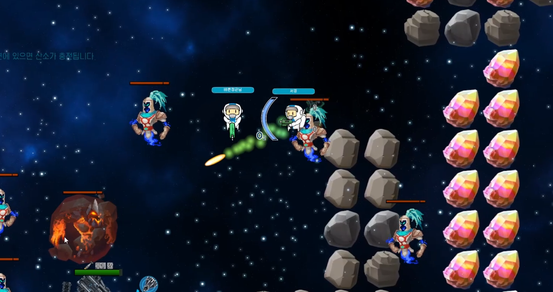 Nomad 엔픽셀_픽셀캠프 프로젝트를 통해 팁 : 공집합의 Nomad 게임입니다. 드넓은 우주에 남게된 당신과 동료들.. 주기적으로 찾아오는 몬스터들에게 대항하기위해서 자원을 캐서 함선과 자신을 업그레이드해서 생존하세요! 1. 닉네임을 설정하세요 2. 방을 만들거나 참가해서 로비에서 게임을 시작하세요 3. 로딩을 기다리세요 4. 게임의 시작화면 입니다. 단축키를 Tab키를 눌러서 확인하세요. 5. 자원을 캐세요! (StarLight, Cazelin 2종류 입니다) 6. 함선을 업그레이드 하세요! 각각의 칸마다 특성이 있습니다. 7. 자원을 통해 업그레이드한 자신을 통해서 몬스터들의 웨이브를 막아내서 생존하세요! 8. 아래와 같이 게임오버가 나지않게 버티면서 생존하세요! 건투를 빕니다.