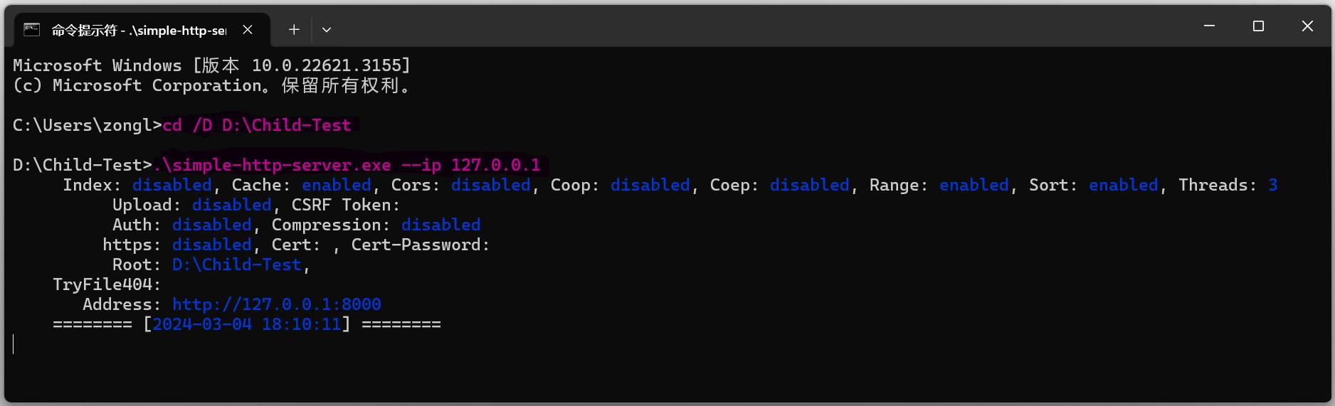 .\simple-http-server.exe --ip 127.0.0.1命令,启动服务; -