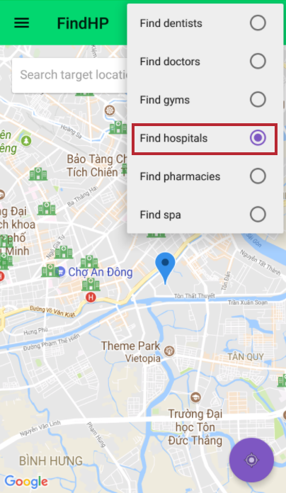 FindHP là một ứng dụng mobile giúp cho người dùng xác định vị trí các dịch vụ về sức khỏe: bệnh viện, nhà thuốc, gyms,.. xung quanh khu vực hiện tại của user hoặc khu vực được chỉ định, đồng thời cung cấp cho người dùng khoảng cách, thời gian đến đỉa điểm cũng như thông tin về nơi đó.