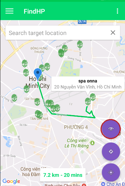 - Hiển thị kết quả là các marker đánh dấu xung quanh vị trí chỉ định trên bản đồ.