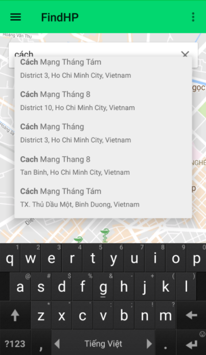 - Cho phép user xác định một kiểu kết quả (nhà thuốc, bệnh viện, nha sĩ, phòng gym, …) trên bản đồ.