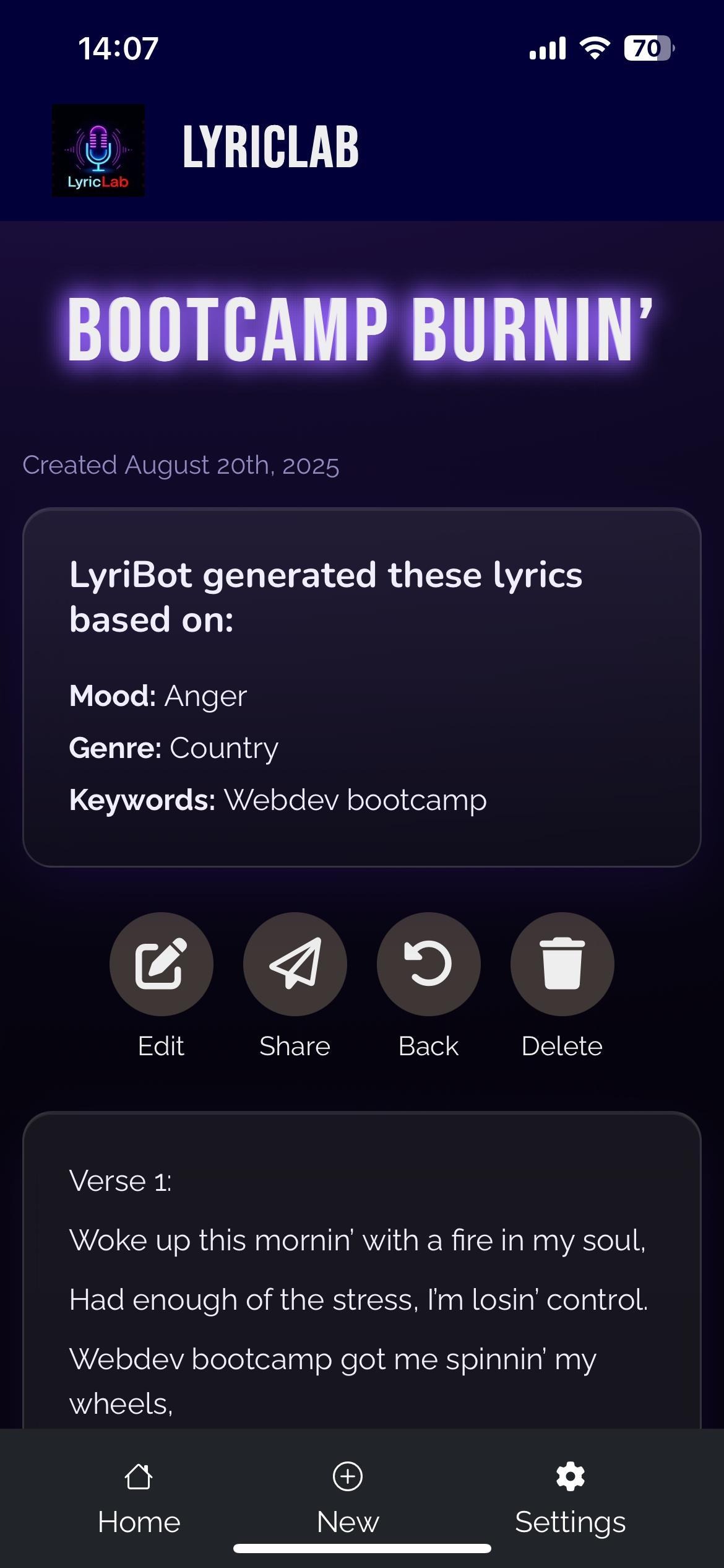 ✨ Features • 🎶 AI Lyrics Generator: Create custom lyrics based on keywords, genres, and moods. • 🖼️ Image-Prompt Uploads: Generate lyrics inspired by uploaded images. • 🤖 LyriBot: Your personal AI songwriting coach. • 🔍 Song Discovery: Browse and filter songs by mood, style, and theme. • 🎨 Modern UI: Clean, responsive design with a focus on creativity.