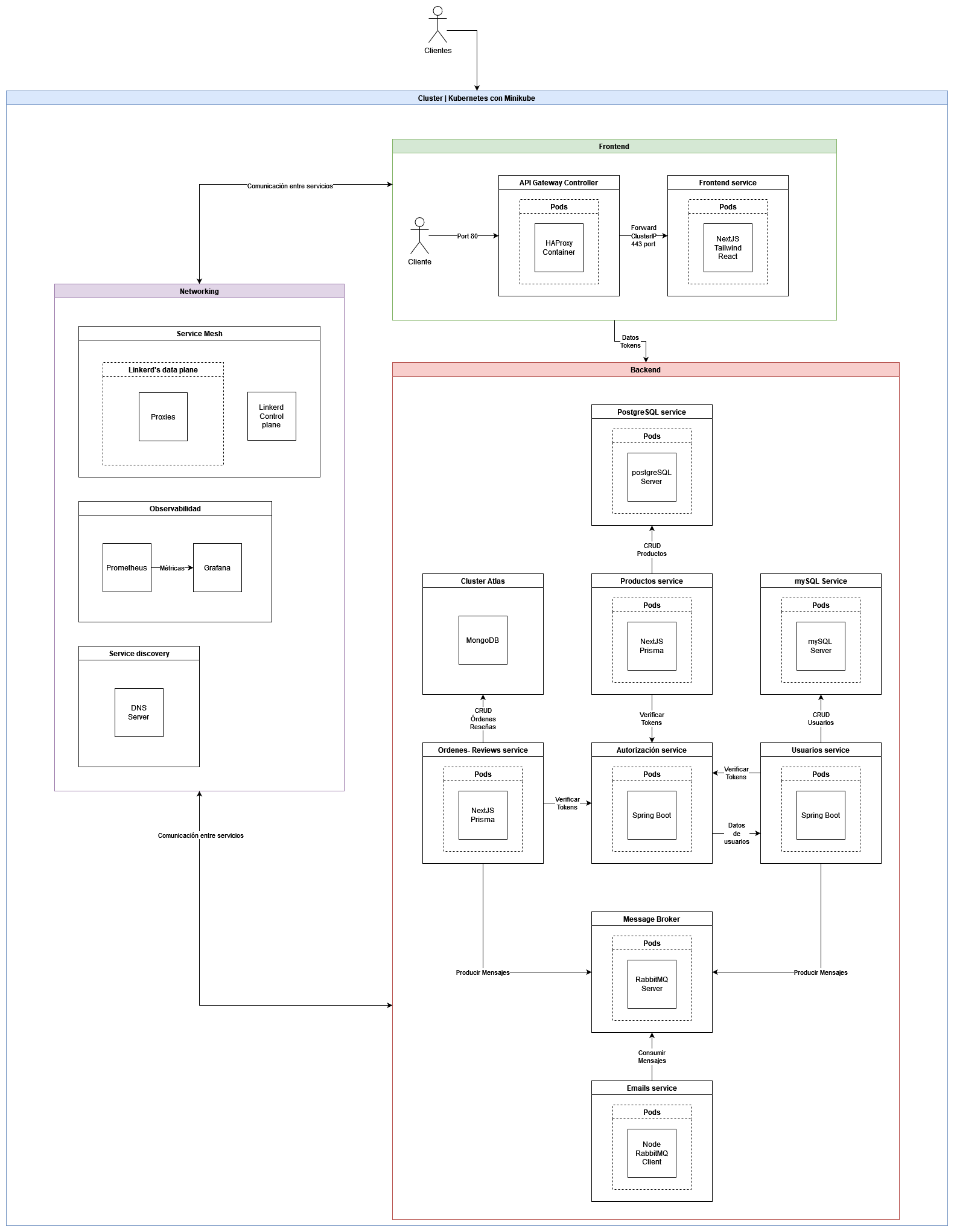 The following is a diagram of the application running inside a kubernetes cluster with minikube.