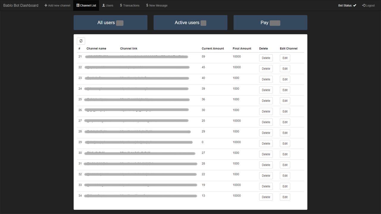 Bablo Bot Бот Bablo Bot позволяет выполнять задания и получать вознаграждения в качестве долларов на виртуальном счету. Python, Flask, pyTelegramBotApi, etc. У бота есть панелья администратора, в которой можно управлять ботом PHP, VueJs, Fetch, Axios