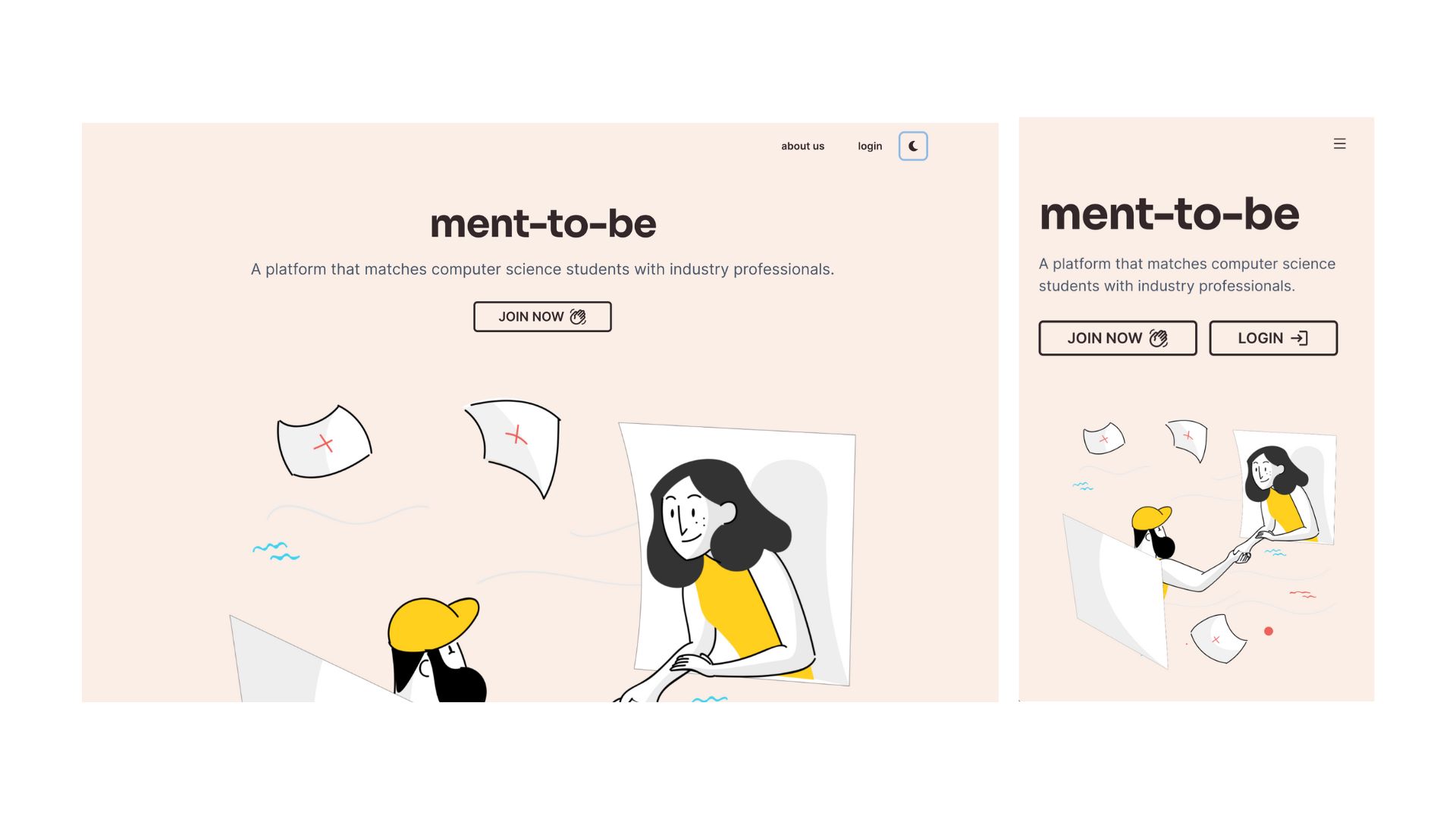 Ment-to Be is an application that aims to match a computer science student with an industry professional that is already working in the industry. Industry professionals can sign up for a volunteering service and provide their calendar schedule of available times. Students can also sign up and wait for a match to occur. The goal of this application is to provide more information to students in a variety of fields within computer science: front-end, back-end, machine learning, and more. It also aims to guide students toward a more clear path for their future and for any career advice they seek to gain from the mentor. There is a chat system between the mentor and the mentee, as well as a reputation system where the mentee can provide feedback to the mentor regarding their experiences and how satisfied they were with our application. Should the mentor receive great feedback from the mentee, they will receive achievements displayed on their profile.