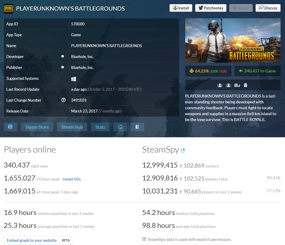 SteamDB is a third-party tool that was made to give better insight into the different applications that Steam has within its database. SteamDB updates in real time the moment that Steam sends its own updates to the Steam client. While SteamDB does not allow data scraping from its own website, it utilized the Steam Web API as well, so the data available on SteamDB can be manually gathered. However, SteamDB is an excellent resource for visualizations of the information given through the API. It contains many different types of graphs and statistics for applications on Steam, such as most played, trending this week, popular releases, price tracking, player count and more. It is a great resource for quick viewing and comparison of counts for specific applications, and it will prove to be useful when we inevitably begin comparing real-time current statistics for applications.