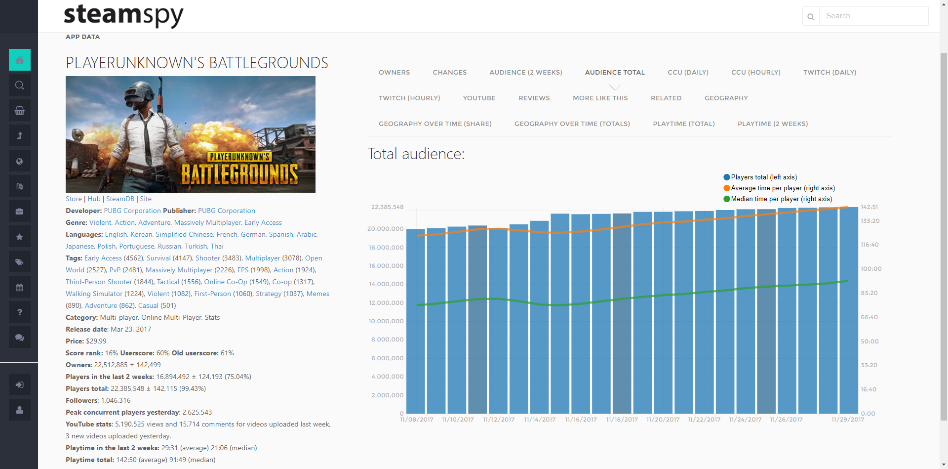 SteamSpy is a third-party tool that works similarly to SteamDB, giving easy access to Steam application data through the Steam API. However, rather than focusing on visualization like SteamDB, SteamSpy focuses more on gathering relevant data for individual games and displaying it in a more accessable way, with download links for .csv files provided to use the data they gather. This makes gathering data for SteamConnect easier, as specifically tagged games, such as early access, can be filtered and downloaded using SteamSpy. The data pulled from SteamSpy is updated by the minute in a similar fashion as SteamDB, giving easy access to real-time updated data from Steam applications.