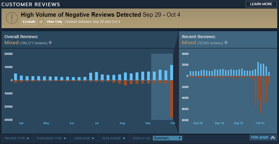 Steam's customer review system allows users to rate games that they have played or purchased. These reviews consist of either a tumbs up or thumbs down review and a text field that allows the reviewer to further explain their reasoning. Other users are also allowed to vote whether the review is considered helpful or not to combat bogus reviews. Steam recently updated the review system, adding in a graph that depicts how reviews for games have changed over time using a bar graph. This will provide useful, as one of the intentions of SteamConnect is to examine these changes in reviews and determine the cause in the changes.