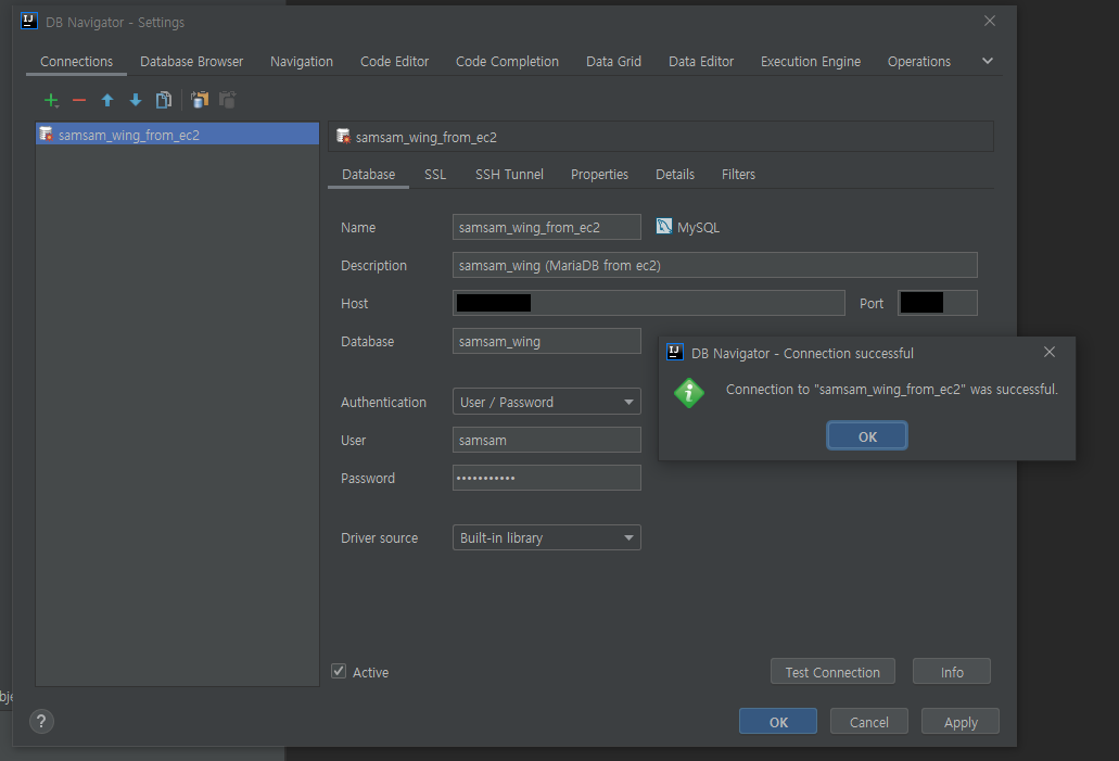 MariaDB [mysql]> grant all privileges on samsam_wing.* to samsam@'%' identified by 'E*********7';
