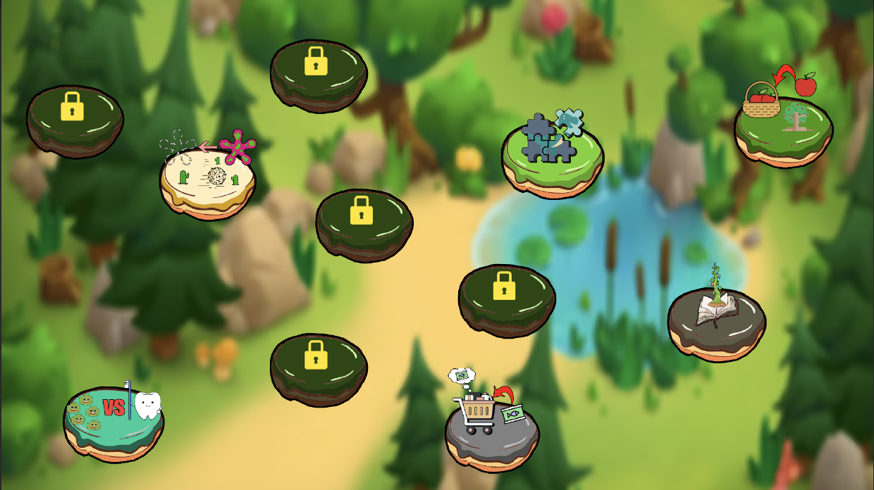 Start button이 눌리면, Stage select 화면으로 넘어오게 된다. 여기서 각각의 미니 게임 스테이지 아이콘을 클릭하면 들어갈 수 있게 된다.