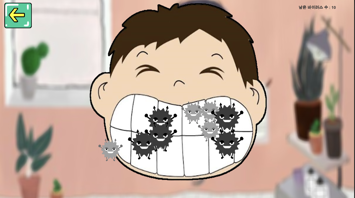 충치를 없애는 것을 해보면서 이를 닦지 않으면, 게임에서 나오는 충치균들이 발생한다는 것을 아이에게 연상시켜 주는 것을 목적으로 한 게임이다.화면 구성으로는 아이와 아이의 이를 보여준다. 이때 충치균들이 이에 발생하는데 이를 단순히 클릭으로 없애는 게임이다. 일정 수의 충치균을 없애면 게임을 마치게 된다. 향후 추가할 내용으로, 충치균들이 일정 수 만큼 늘어나게 되면 게임오버 시켜 아이에게 이를 닦지 않았을 때 어떻게 되는 지를 보여준다.