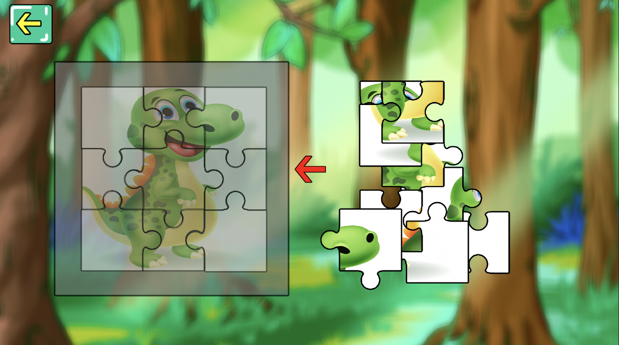 아이의 공간지각력 향상을 위한 단순한 퍼즐 게임이다. 화면 구성으로는 아이들이 좋아하는 ip인 공룡을 활용하여 친숙한 퍼즐 게임을 구성하였다. 9조각의 퍼즐조각으로 구성되어 있으며, 오른쪽에 임의로 배치된 퍼즐 조각을 드래그해서 왼쪽의 퍼즐판에 맞추는 게임이다. 퍼즐을 완성시키면 게임을 마치게 된다. 향후 퍼즐의 종류를 늘려 퍼즐을 맞추었을 때, 공룡이면 한국어로 공룡, 영어로 공룡의 이름을 말로써 들려주어 연상시키도록 할 예정이다.