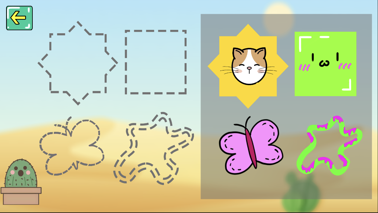 아이의 공간지각력 향상을 위한 단순한 도형 맞추기 게임이다. 화면 구성으로는 왼쪽에는 도형 틀과 오른쪽에는 도형이 존재한다. 이때 플레이어는 도형을 드래그하여 맞는 도형틀에 집어 넣어야 한다. 향후 틀리면 틀렸다는 효과음과 애니메이션을 추가할 예정이다.