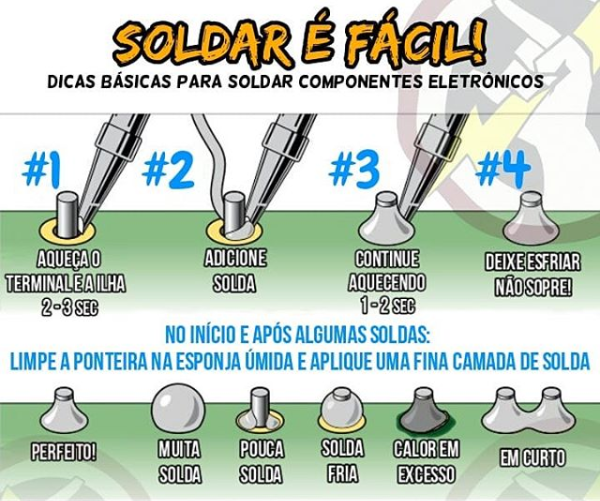Veja o vídeo que ensina o básico de soldagem eletrônica. O objetivo do vídeo é pegar a ideia principal de soldagem eletrônica, detalhes serão passados mais adiante.