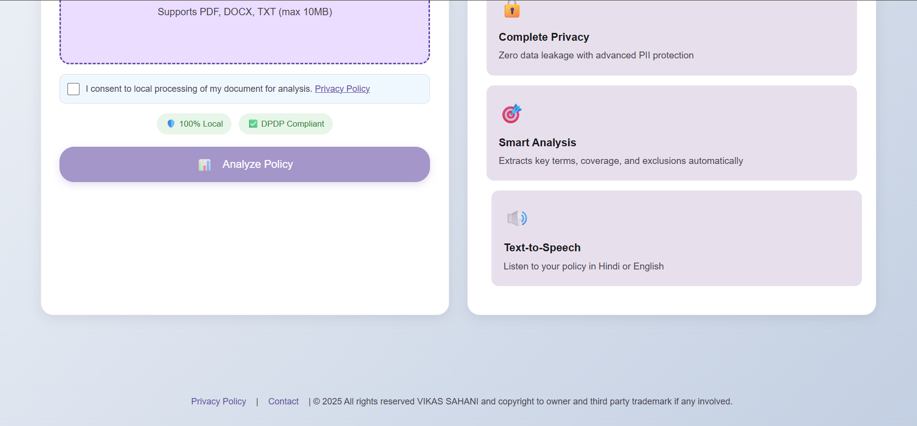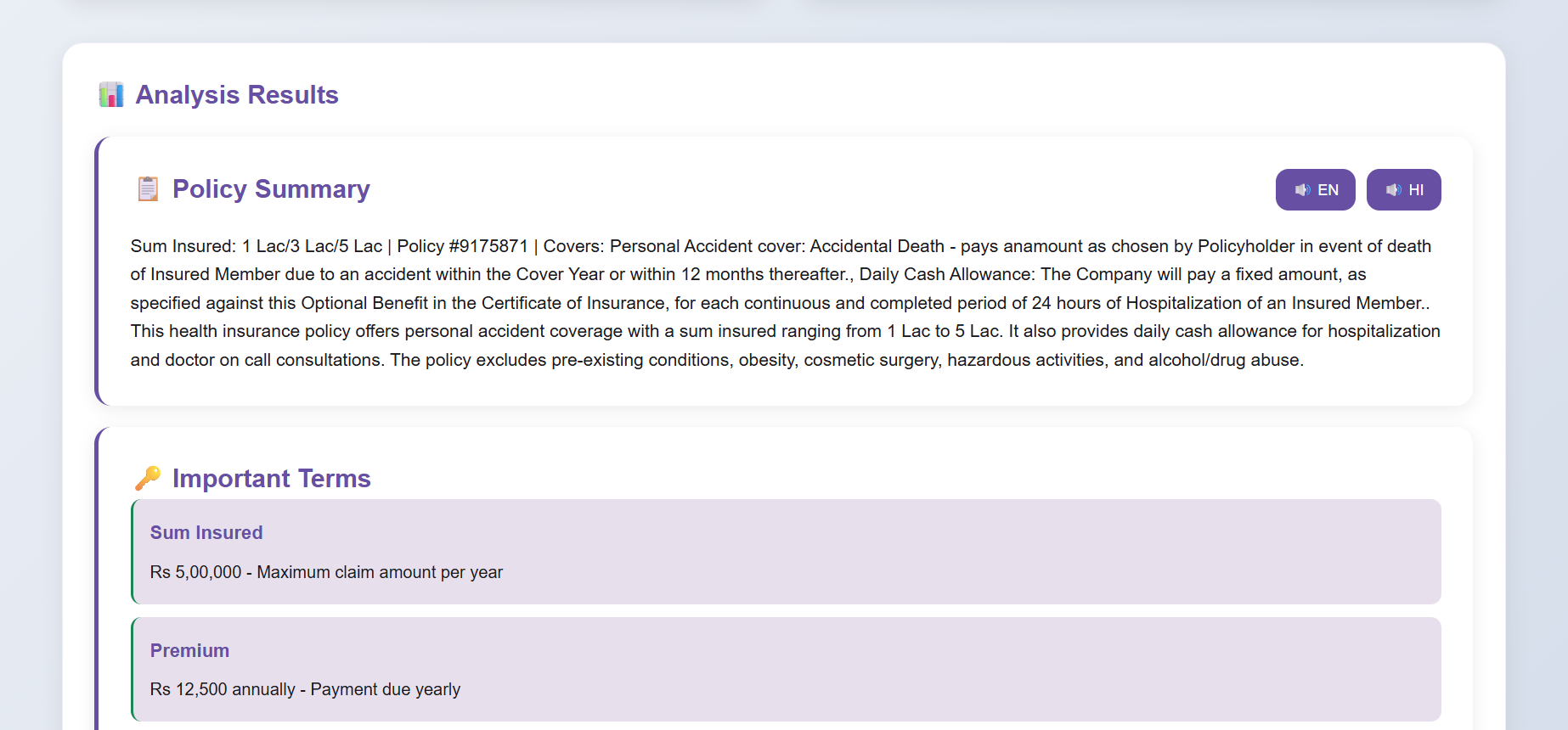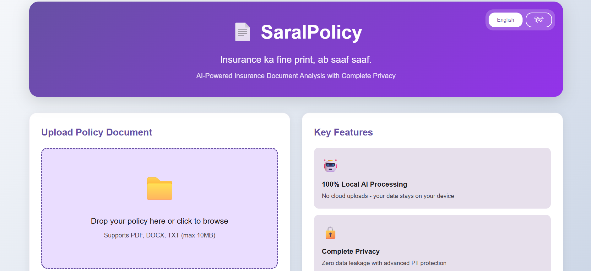 An AI-powered insurance document analysis system (POC/Demo) that uses local AI models to provide clear, easy-to-understand summaries in Hindi and English, with comprehensive guardrails and human-in-the-loop validation. All processing happens locally for complete privacy.