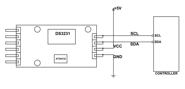 As shown in circuit diagram the module is connected to +5V power supply. The module can work on +5V regulated power and higher voltage may damage the module. The I2C interface is established as shown in figure. All you need to do is connect SDA of module to SDA of controller and SCL is connected to SCL of controller or you can also use A4(Analog pins) for SDA and A5 for SCL pins.