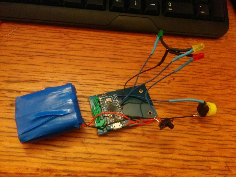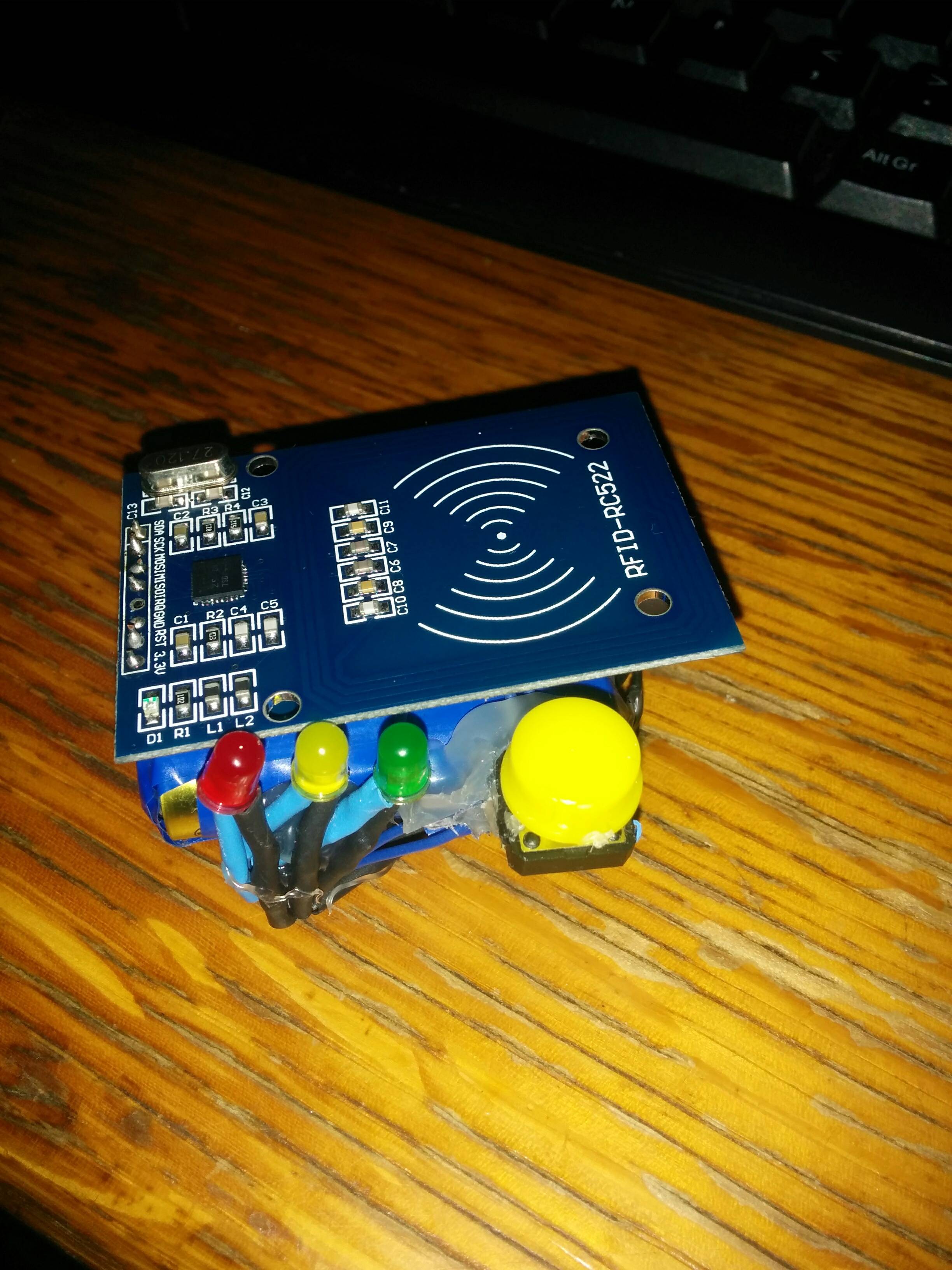 This project is based on the RFID library created by Miguel Balboa and other contributors. I just merged 2 of examples from it into 1 (read/write + UID change) and added the button/LEDs/batteries/workflow.