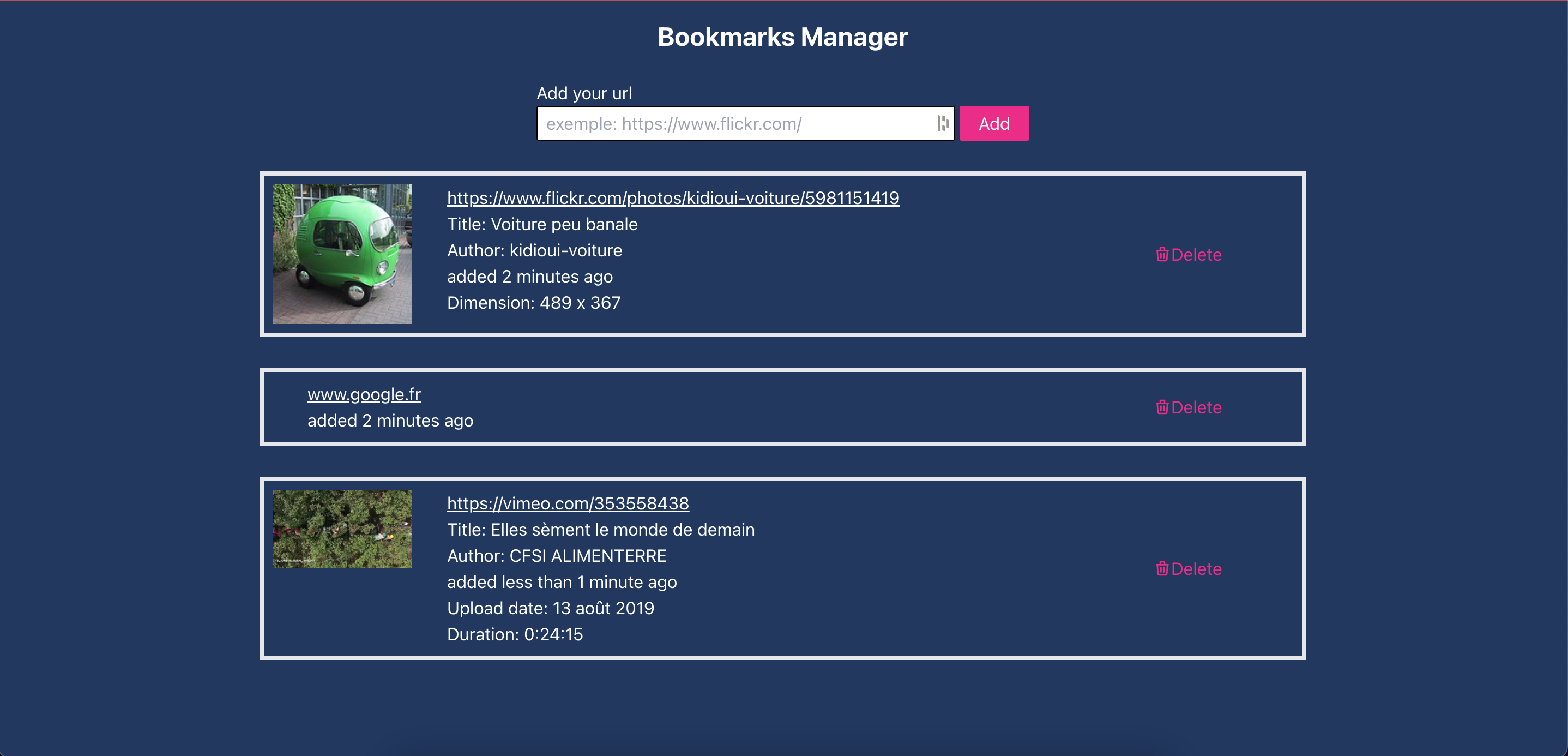 It's a bookmark manager that takes Flickr and Vimeo type urls to display the following data depending on the type of url.