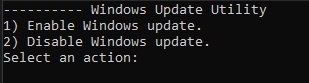 UpdateDisabler CLI Usage: DisableWindowsUpdate.exe [-e|-d] (enable or disable)