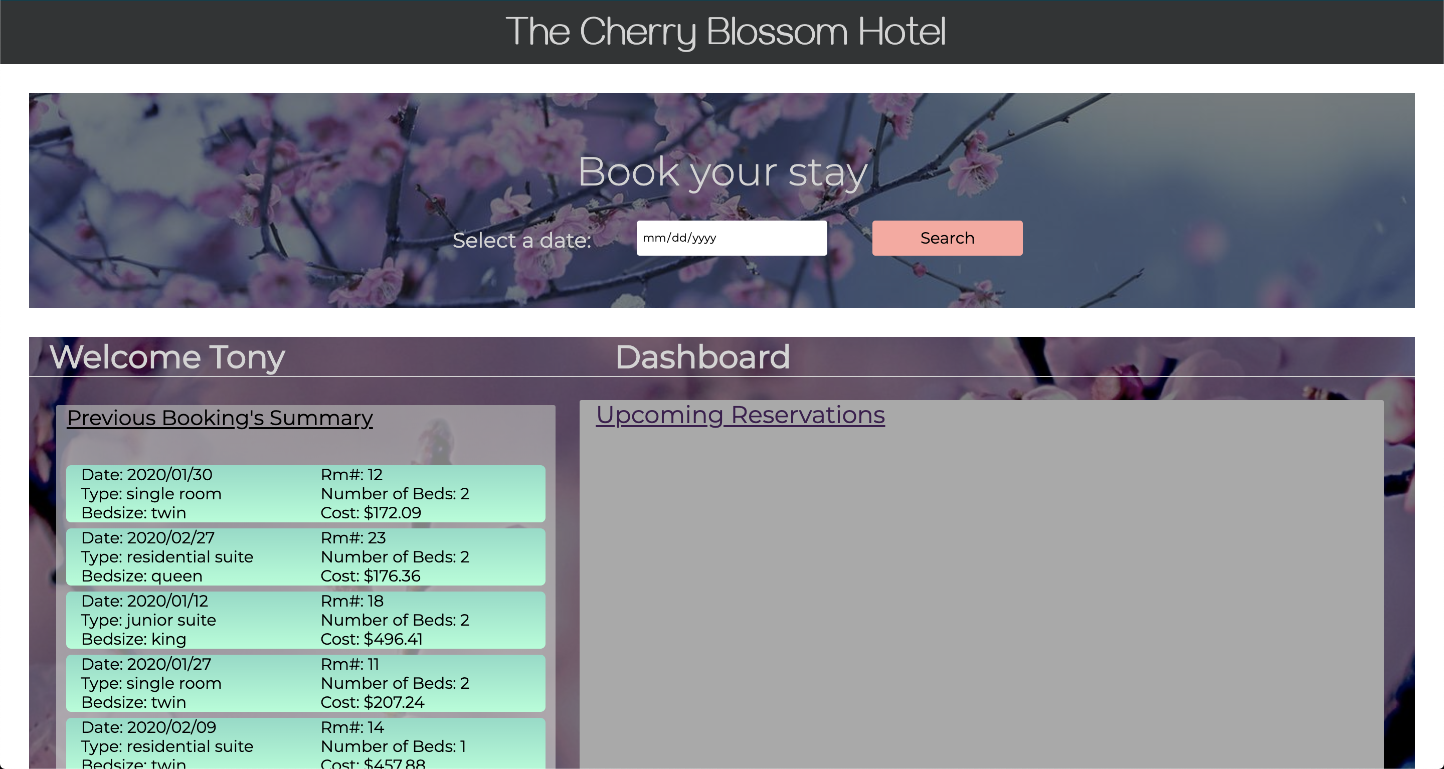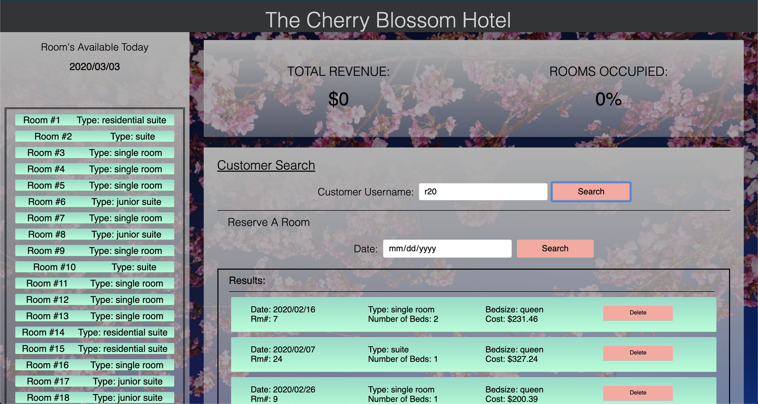 In this project, I built a website designed to act as a hotel management tool for hotel customers and staff to manage room bookings and calculate customer bills. As a manager you are able to see a dashboard that contains the rooms available in the hotel, see todays revenue, and a visual representation of the occupancy. As a Customer, your dashboard shows all your past and future bookings, as well as how much you've spent with the hotel up to today. Of course with all hotel sites, you are given the option to book a room and view its' amenities for context.