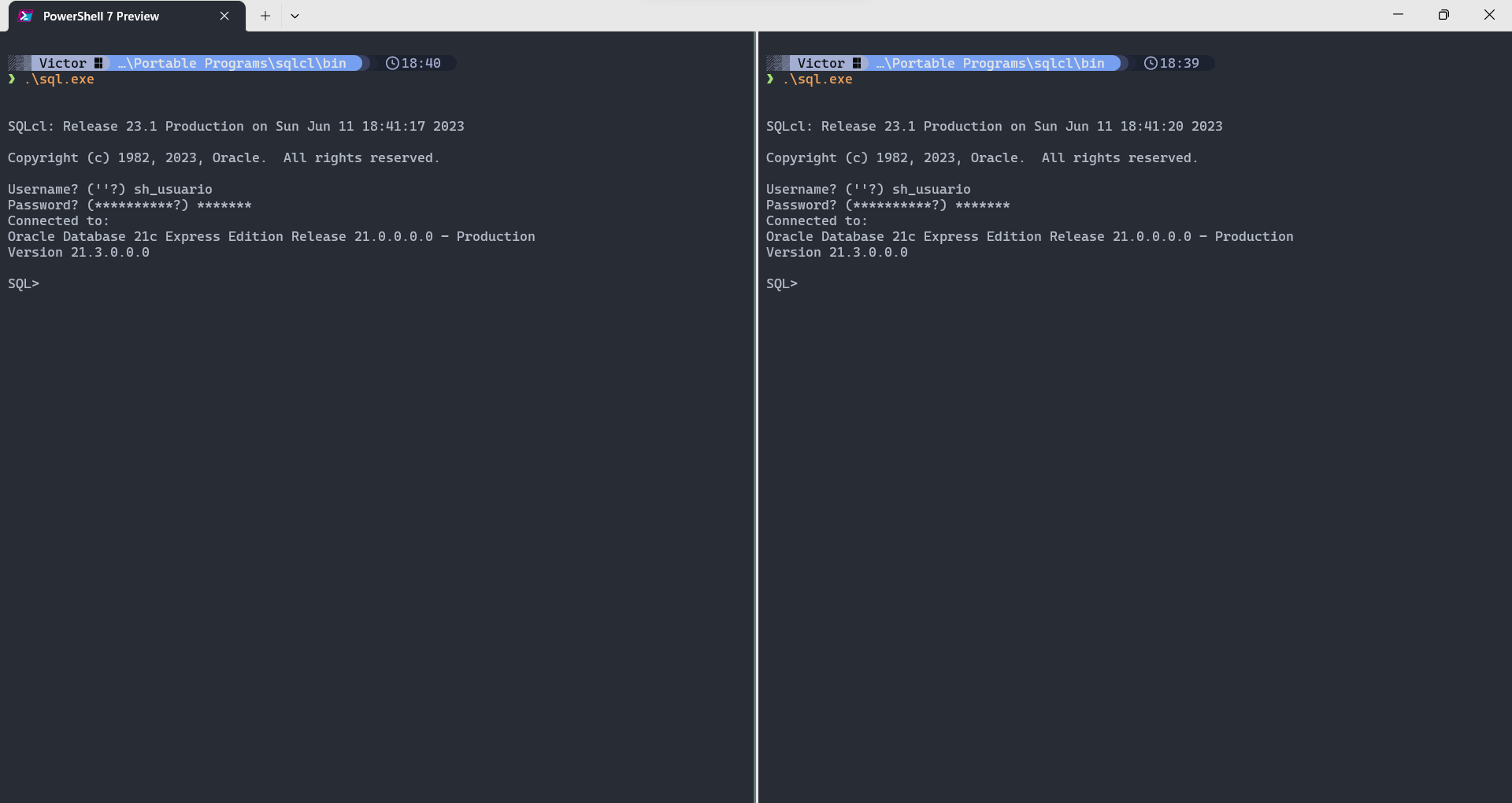 - Abrir o SQLcl ("Programas\SQLcl\bin\sql.exe") e conectar-se ao banco de dados com o usuário "SYSTEM" e a senha definida na instalação;