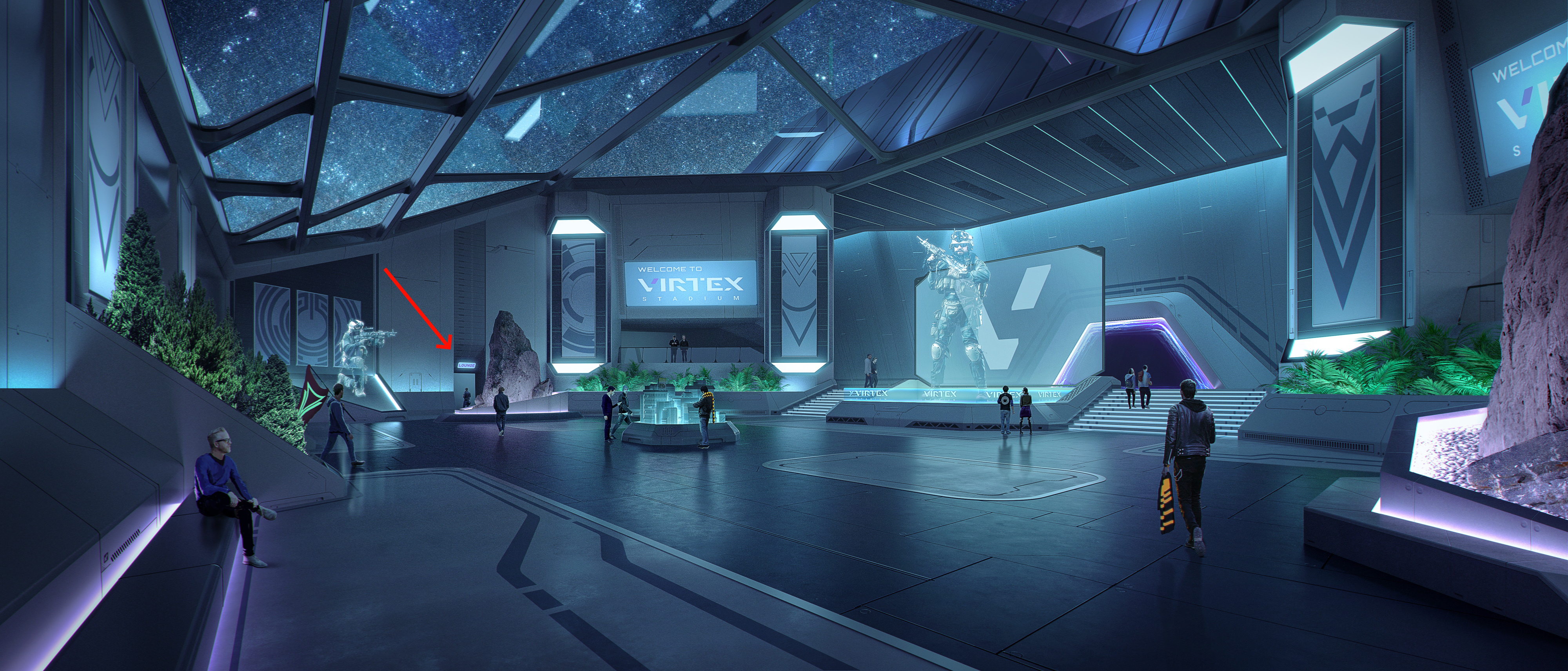 We have two environments (Plaza and Lounge) and need to connect the two areas with a liminal space. We do not have any concept art for this area and need you to help extrapolate the style of the two environments into an area that naturally connects the two.