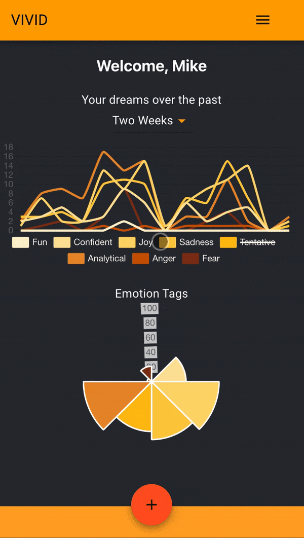 Use VIVID to log your dreams and receive back an analysis of unique tones inside of them. Track these tones over time with interactive charts detailing the frequency of your emotions over time.