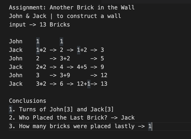 No. of times John and jack came to put up the brick-> john(3), Jack(3)
