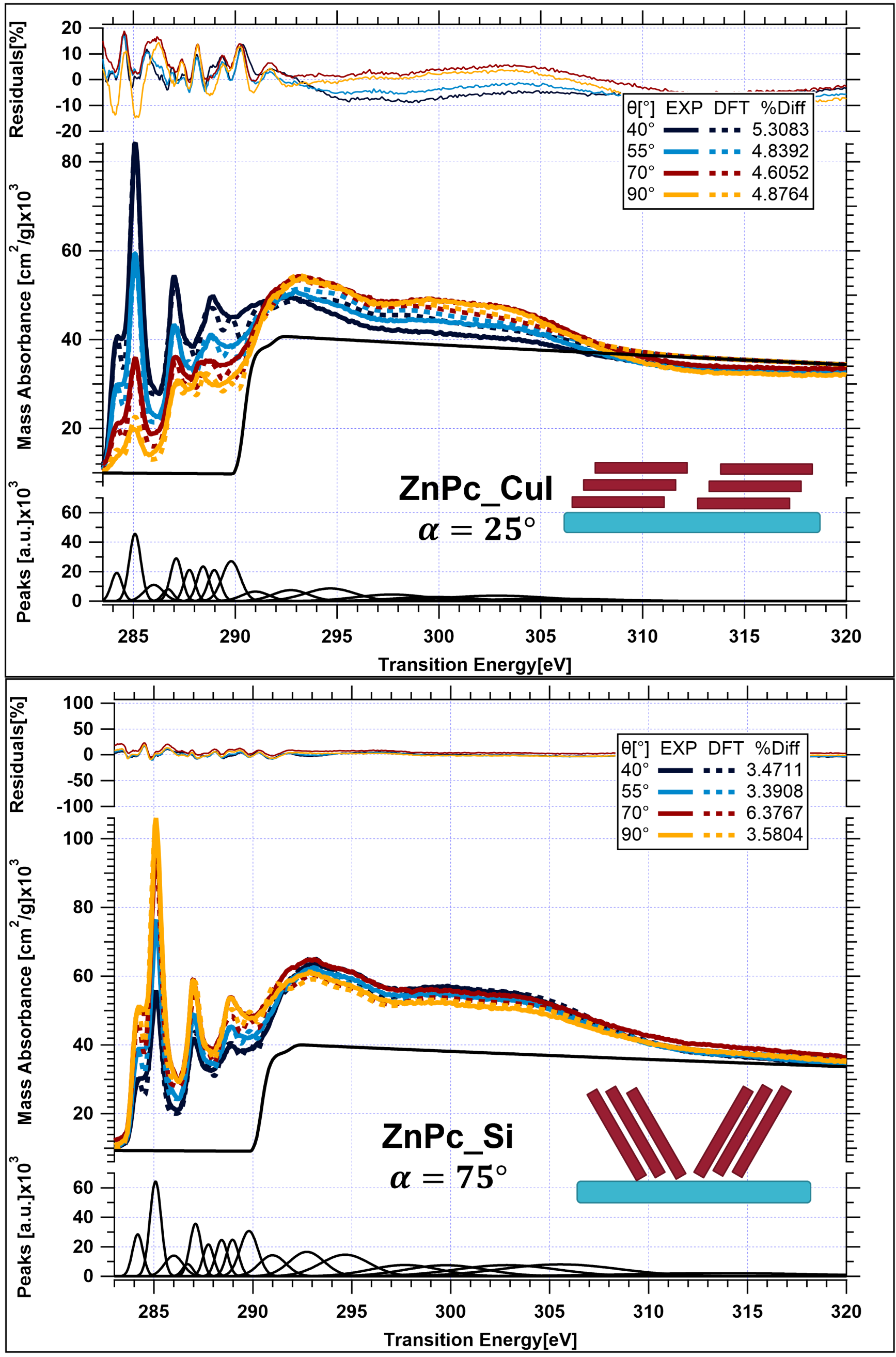 These peak overlaps can then be subsequently used to generate a more compact set of peaks (i.e. transition clusters) that are representative of all the transitions initially calculated by the TP-DFT. The transition clusters are then combined with angle-resolved NEXAFS measurements in order to generate a quantitatively accurate optical model derived from first principle calculations.
