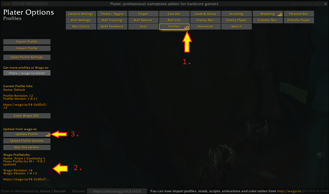 • Now open the Plater options panel in-game and look for the wago icons on the Scripting, Modding or Profiles tab. Those icons indicate available updates in this category, as can be seen on (1.) on the screenshots below.