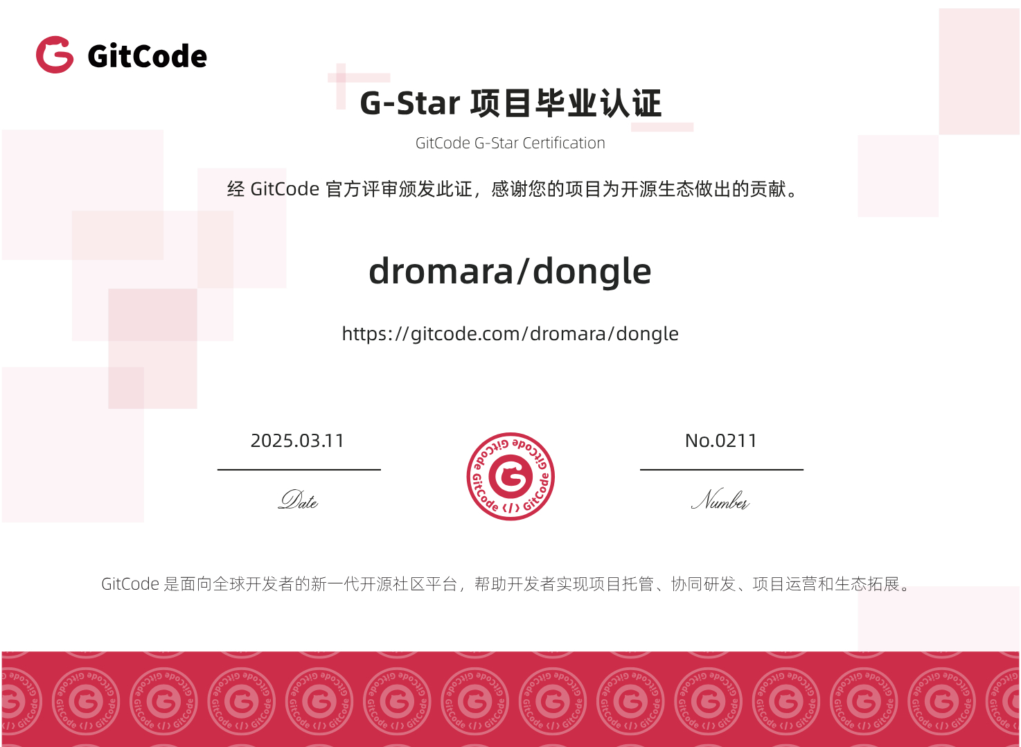 go get -u gitcode.com/dromara/dongleDongle was donated to the dromara organization, the repository URL has changed. If