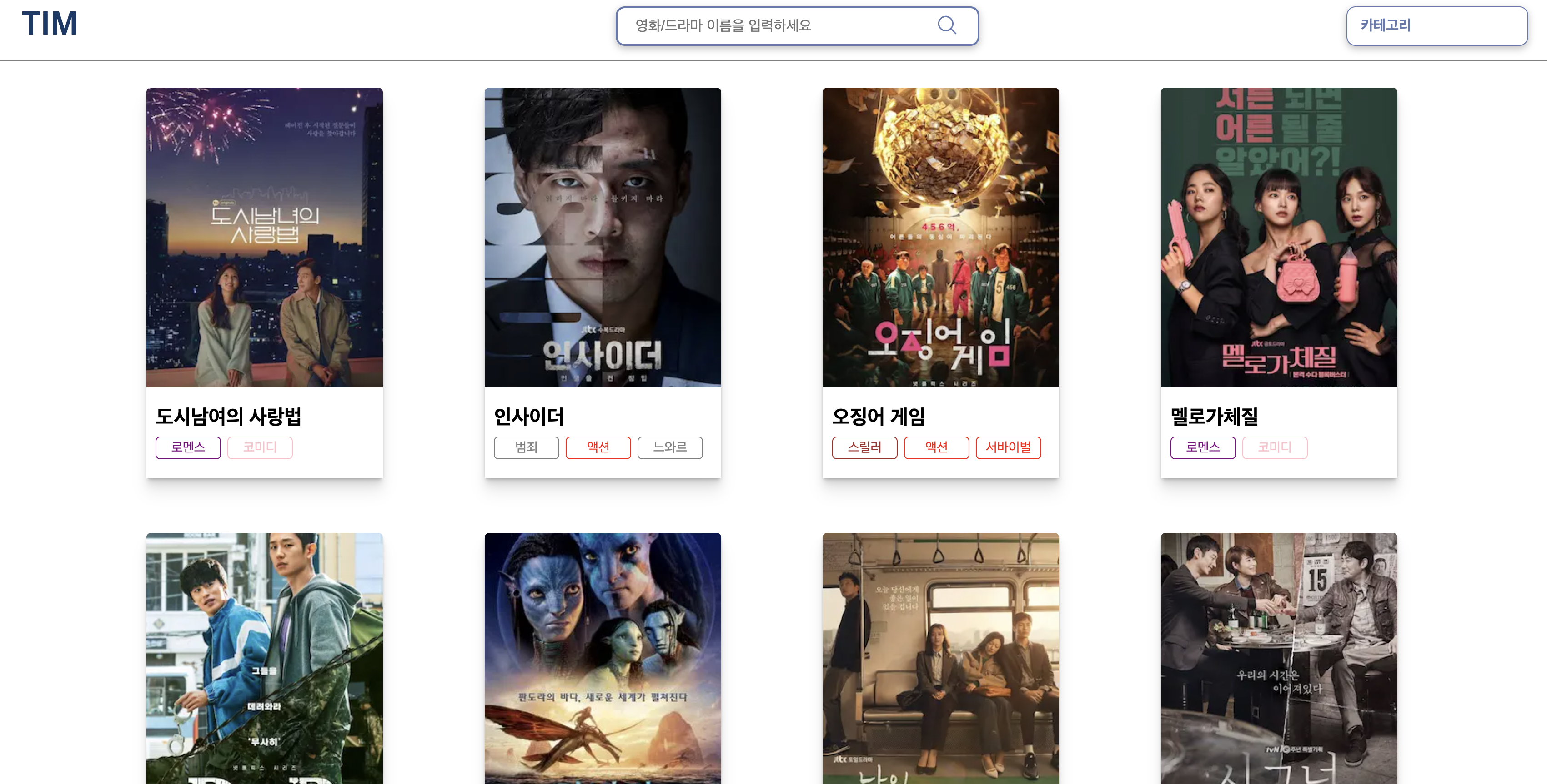 TIM today i media 의 약자로 노션 db 를 사용해서 오늘 본 영화/드라마같은 미디어 컨텐츠를 기록하는 웹사이트입니다 사용한 기술 next.js notion db typescript recoil 메인페이지 상세페이지