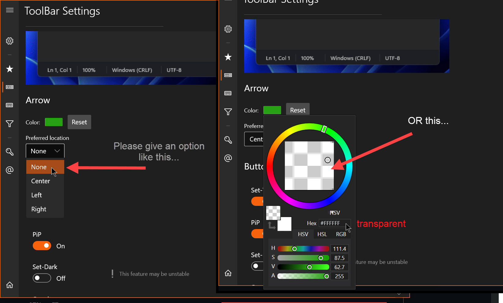 Can you add an option to make the arrow invisible or not appear at all so we don't have to see the arrow to use the toolbar?