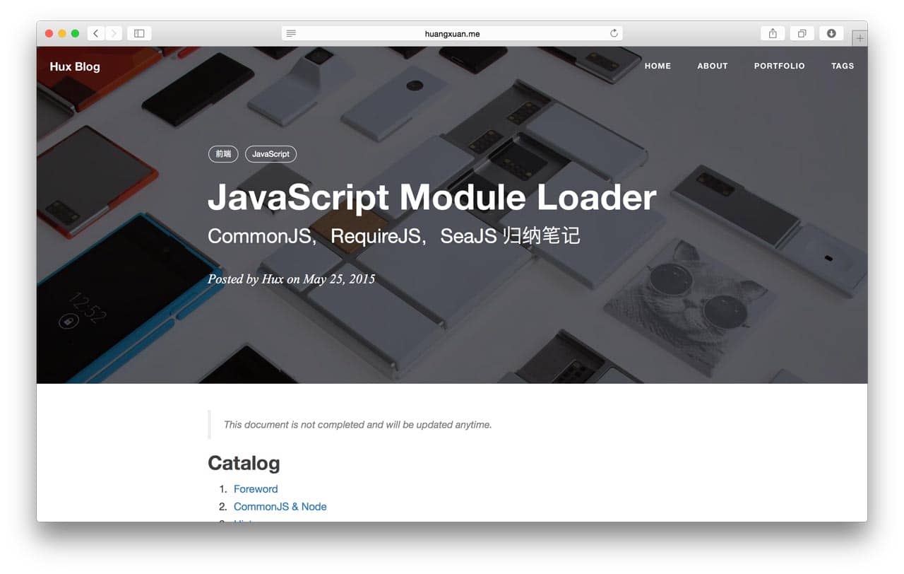 $ bundle exec jekyll serve # alternatively, npm startTo modify the theme, you will need Grunt. There are numbers of tasks you can find in the Gruntfile.js, includes minifing JavaScript, compiling .less to .css, adding banners to keep the Apache 2.0 license intact, watching for changes, etc.