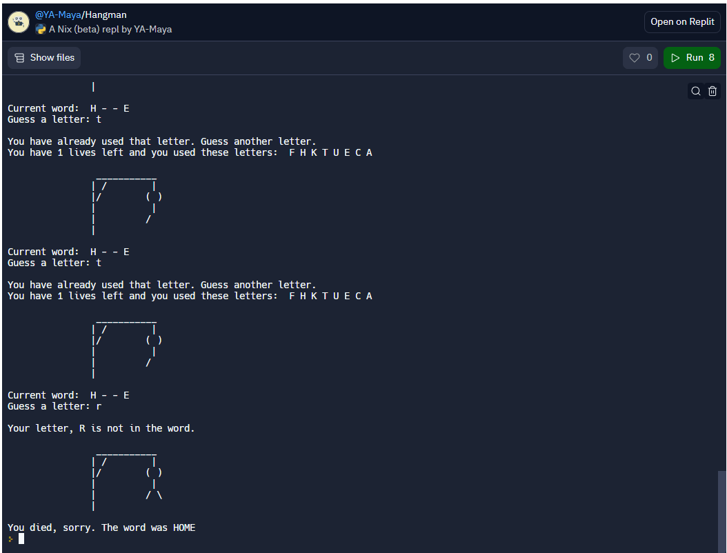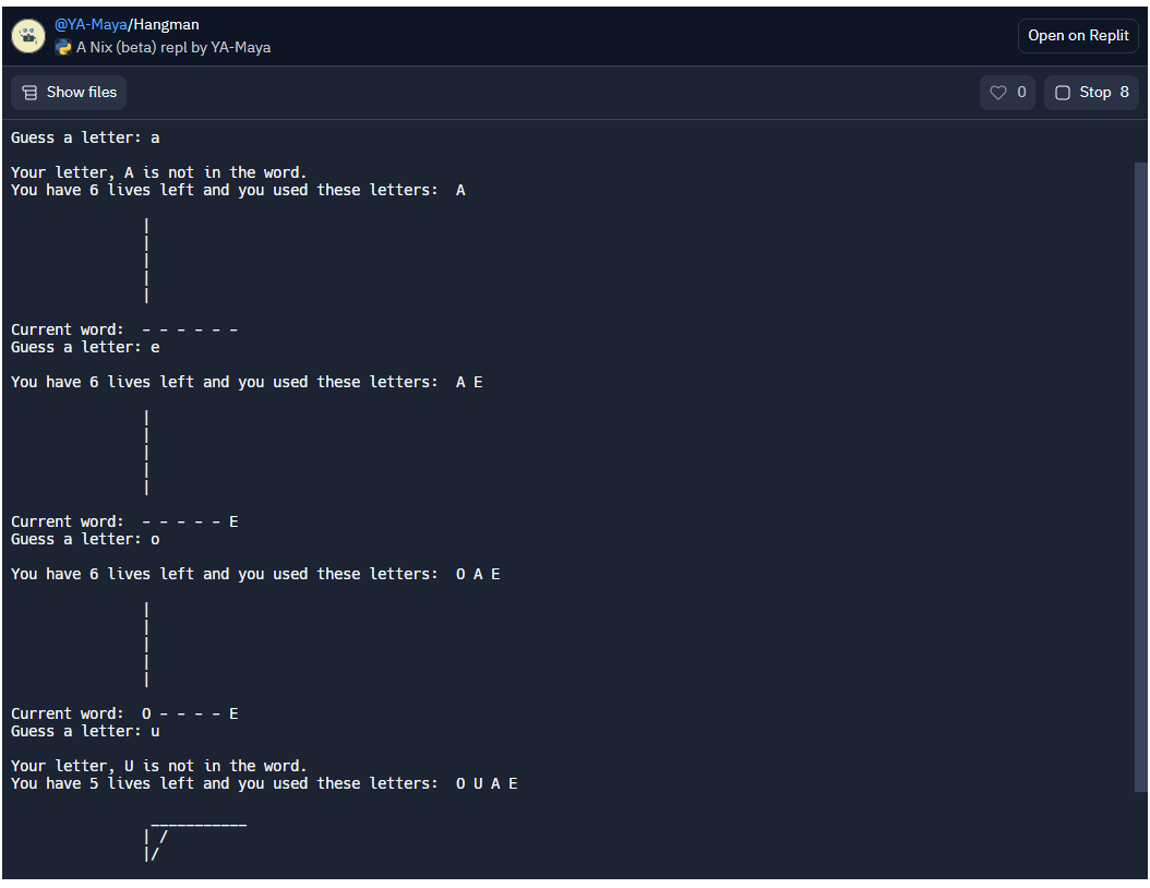 To create my hangman game, I turned to Stack Overflow to find a JSON wordlist with over 50k words, which proved invaluable. Using Python, I carefully planned out the project, despite its relative simplicity. I was inspired to create this game after spending enjoyable hours playing it with my sister during a family gathering, and I wanted to test my abilities by developing it myself.