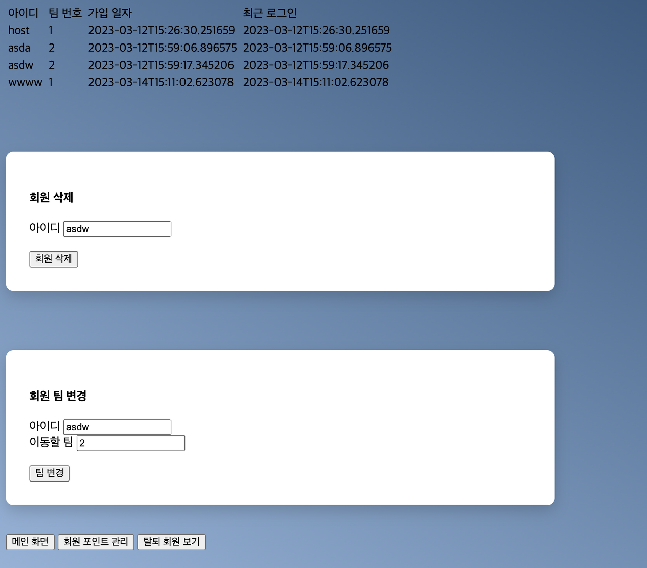 회원 계정 관리 페이지에서는 회원를 삭제 할 수 있고, 회원의 팀을 이동시킬 수 있다. 없는 회원이라면 에러 페이지를 발생 시켰다.