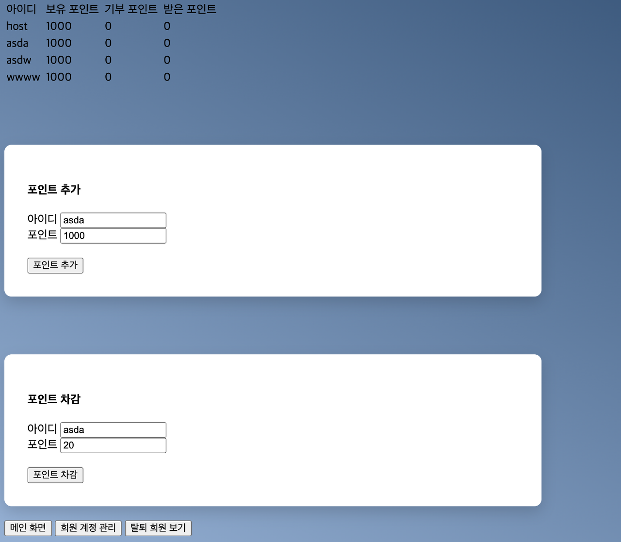 회원 포인트 관리 페이지에서는 회원의 포인트 증감, 차감이 가능하다. 이 역시도 없는 아이디면 에러 페이지를 발생 시켰고, 차감한 포인트가 음수가 되면 0점이 되도록 예외 처리를 해주었다.