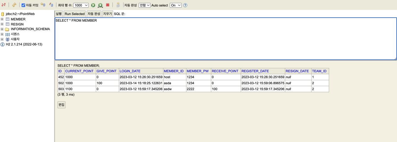 관리자 아이디로 로그인 한 경우이다. 각 회원들의 정보들을 볼 수 있으며, 아래의 button 을 통해 원하는 기능을 수행 할 수 있다.