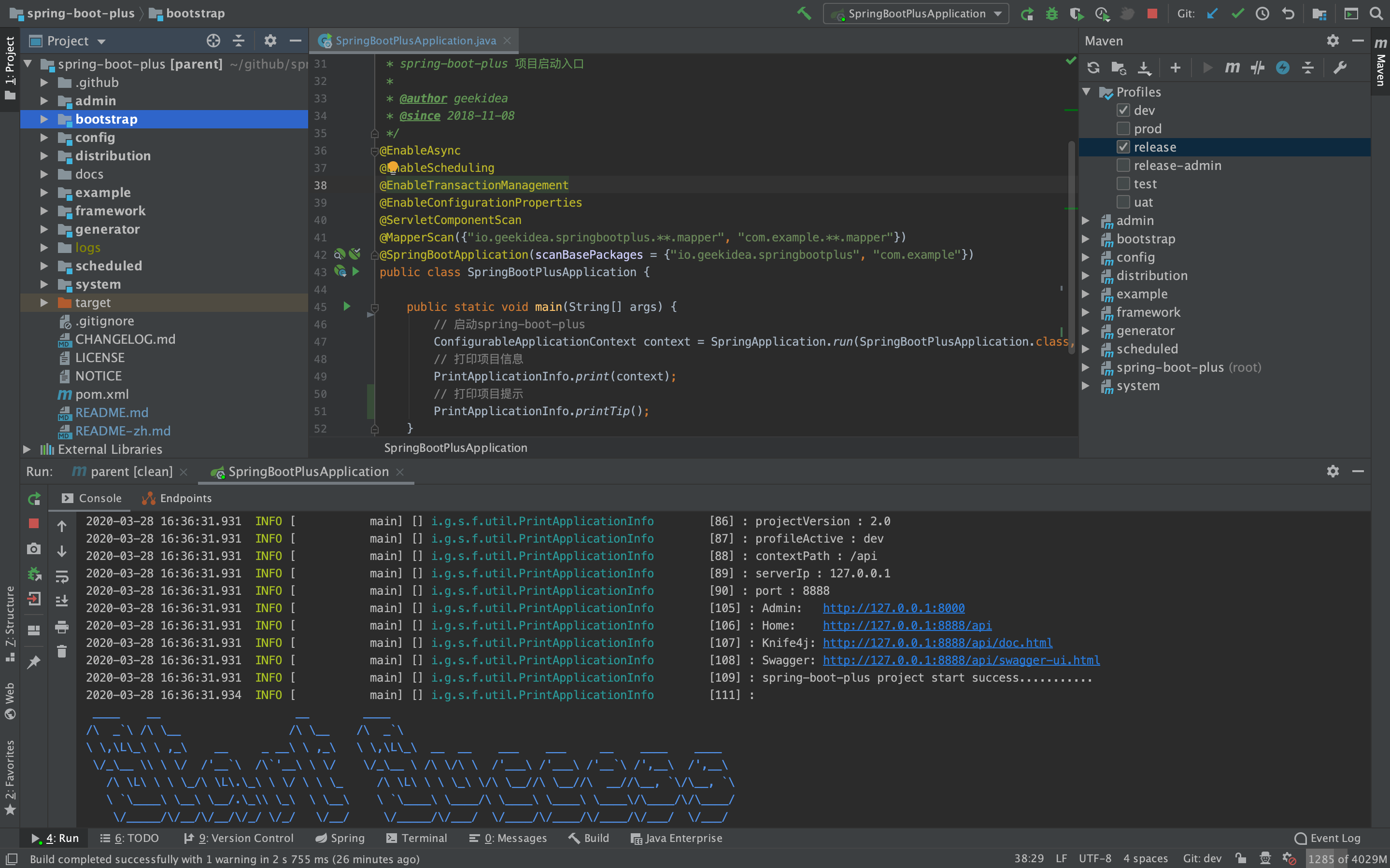 cd spring-boot-plusdev environment is used by default, The configuration file:application-dev.yml