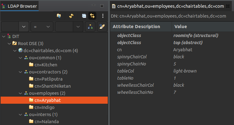 The verification of the addition of the entries was done by visiting the ApacheDS - which could have also been done using LDAPSearch by running a command like ldapsearch -H ldap://localhost:3389 -D "cn=Directory Manager" -w "[!REDACTED!]" -b "dc=company,dc=com" -LLL - More on this in the coming section but -b refers to base/suffix/root of the DIT, essentially searching the entire DIT to match the condition.