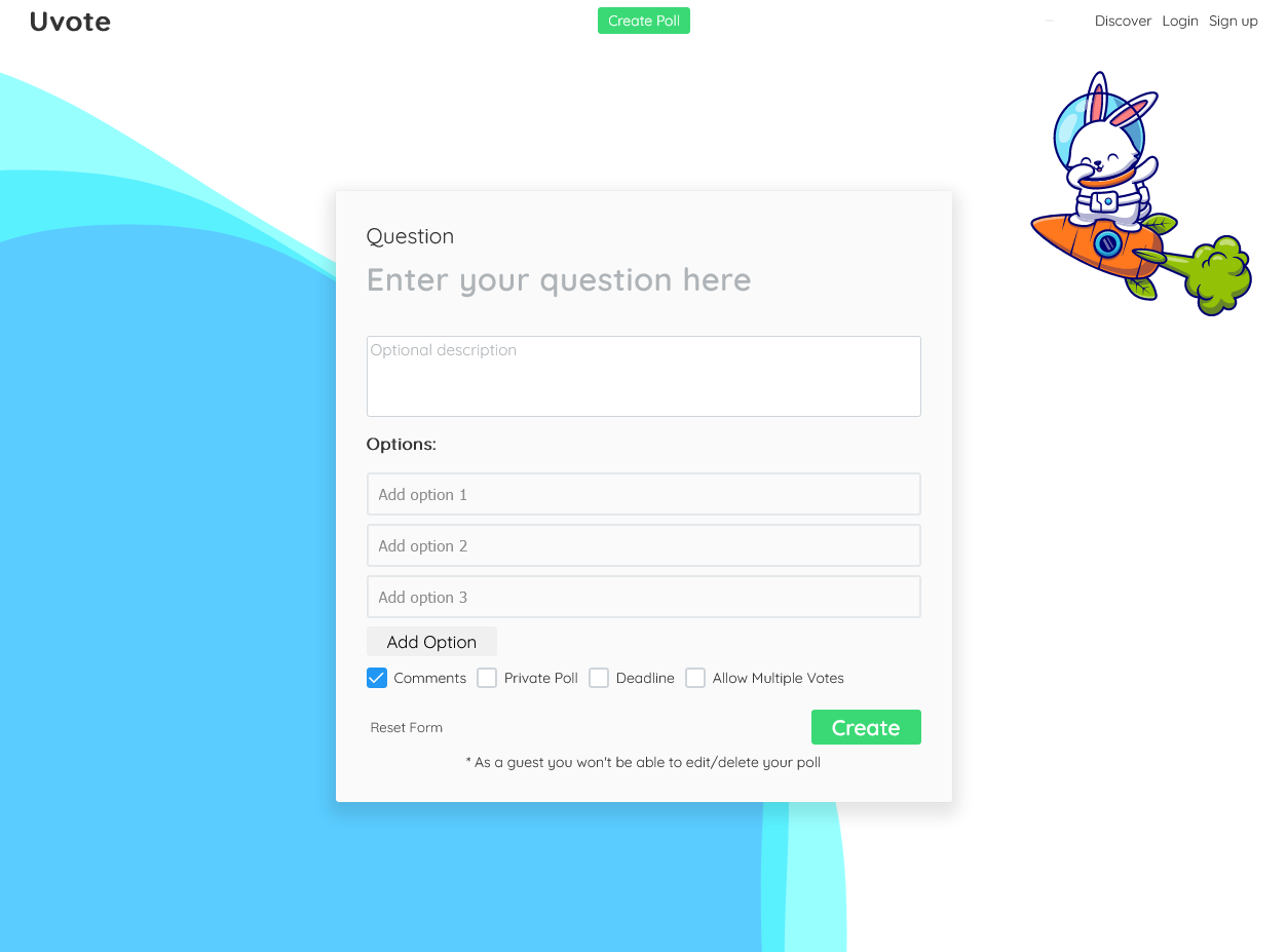 Uvote Uvote is a straw poll application built with Angular 11, MongoDB, Express and Node.js. Link to app Getting started locally git clone https://github.com/Yonisegev/uvote.git cd uvote npm i npm run start:dev open new terminal && cd server npm i npm start