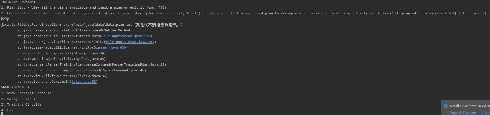When string input (incorrect command) (e.g help), is keyed into: - 1. View Training Schedule - 3. Trianing Circuits There is FileNotFoundException error and program crashed.